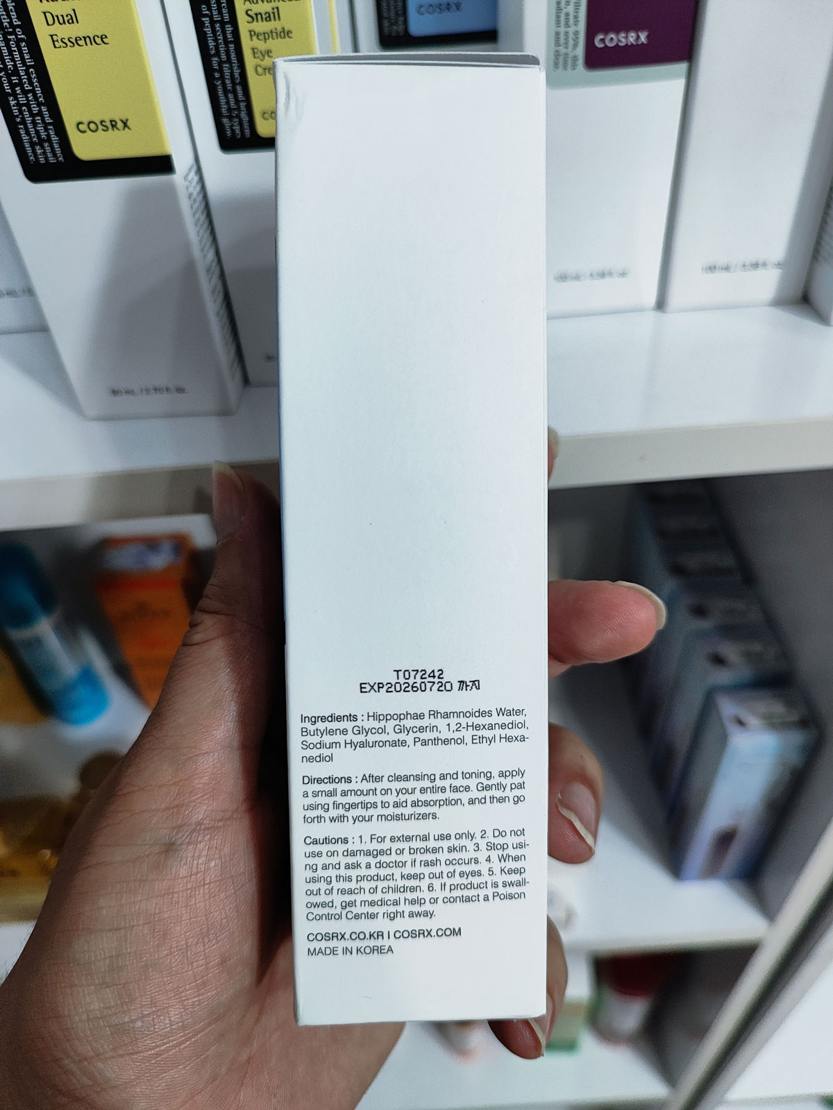 این اسانس برای انواع پوست، به ویژه پوستهای خشک مناسب است. استفاده همراه با کرم آبرسان هیالورونیک اسید کوزارکس (COSRX Hyaluronic Acid Intensive Cream)، تغذیه و آبرسانی عمیق به پوست را فراهم میکند. ماده کلیدی آن اسید هیالورونیک (سدیم هیالورونات) و آب Hippophae Rhamnoides است.
