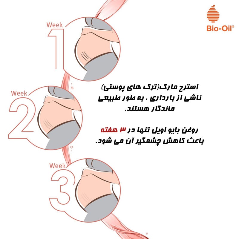 در دوران بارداری از ابتدای سه ماهه دوم ، روزی 2 بار، Bio Oil را روی شکم، باسن، سینهها، کمر و قسمتهای فوقانی ران ماساژ دهید.