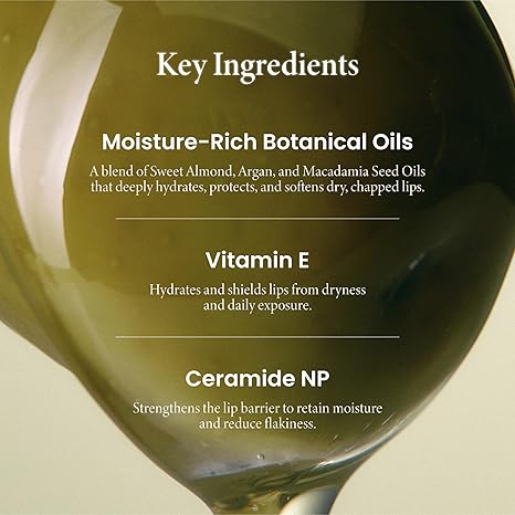 سرامید NP (Ceramide NP): این ترکیب اساسی، سد دفاعی لب را بازسازی کرده و به طور مؤثری از تبخیر رطوبت جلوگیری می‌کند، که برای لب‌های خشک و حساس حیاتی است. مجتمع روغنی غنی (مانند روغن زیتون، روغن ماکادمیا، روغن بادام شیرین): این روغن‌های مغذی، لب‌ها را عمیقاً تغذیه کرده و خشکی را تسکین می‌دهند. روغن زیتون منبع عالی ویتامین E و اسیدهای چرب ضروری است.ویتامین E و پانتنول: ویتامین E خاصیت آنتی‌اکسیدانی دارد و پانتنول (پروویتامین B5) به شدت آبرسان و تسکین‌دهنده است و به بهبود زخم‌ها و ترک‌های کوچک لب کمک می‌کند
