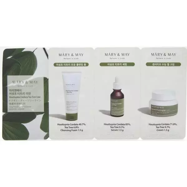 ساشه مراقبت از پوست مری اند می “Mary&May Houttuynia TeaTree Line 3 Step” یک کیت مراقبتی متمرکز است که توسط برند کرهای Mary&May برای پوستهای مستعد آکنه، چرب و حساس که نیاز به تسکین، کنترل چربی و مراقبت از منافذ دارند، طراحی شده است.