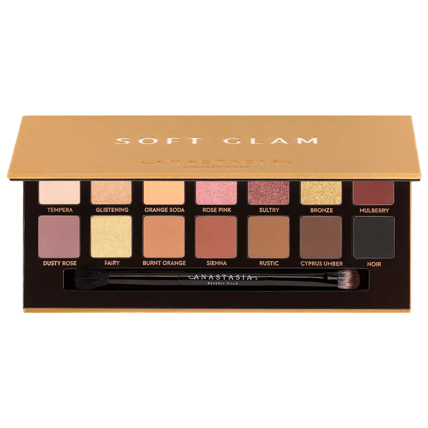 پالت معروف سافت گلام از برند آناستازیا شامل 14 رنگ خنثی،متالیک و شاینی مانند رنگ های صورتی پاستیلی ،هلویی و قهوه ای گرم است.