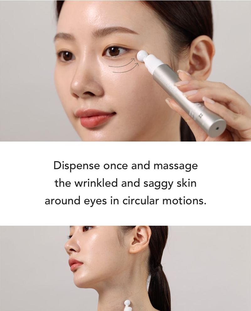 آمادهسازی: پس از استفاده از تونر و سرمهای صورت، با فشار دادن ملایم تیوپ، مقدار کمی از محصول را روی غلتک فلزی پمپ کنید (معمولاً یک پمپ برای هر دو چشم کافی است).