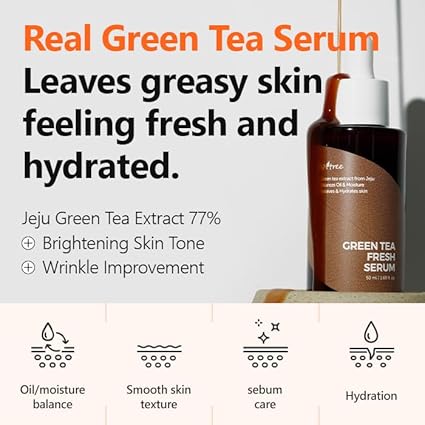 سرم چای سبز ایزنتری ISNTREE Green Tea Fresh Serum یک سرم مرطوبکننده و تنظیم کننده تولید سبوم (چربی پوست) است که با استفاده از عصاره چای سبز از جزیره جِجو تهیه شده و 77% از ترکیبات آن را تشکیل می دهد. این سرم به بازیابی تعادل آب و چربی در پوست کمک کرده و به روشنسازی و صاف کردن خطوط ریز پوست می پردازد. همچنین، بدون رنگهای مصنوعی بوده و برای پوستهای چرب و ترکیبی مناسب است.
