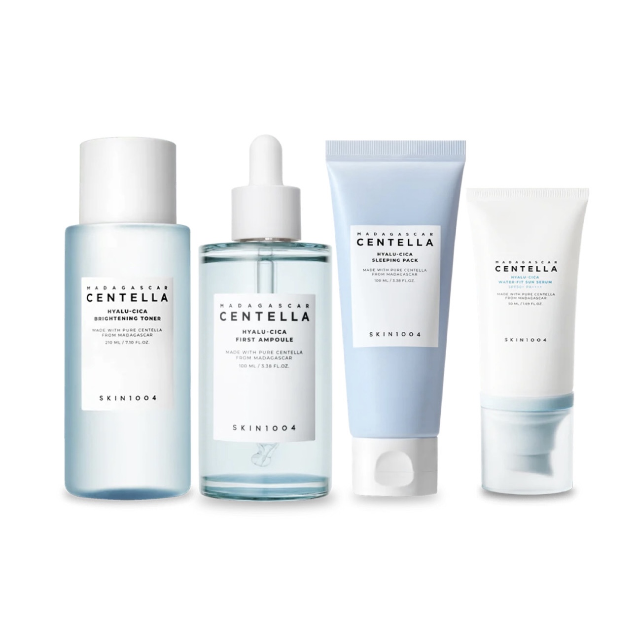 پک آبرسان و مرطوب کننده هیالو سیکا اسکین 1004 [SKIN1004 Madagascar Centella Hyalu-Cica Brightening Toner و SKIN1004 Madagascar Centella Hyalu-Cica First Ampoule و SKIN1004 Madagascar Centella Hyalu-Cica Sleeping Pack و SKIN1004 Madagascar Centella Hyalu-Cica Water-Fit Sun Serum SPF50+ PA++++]یک انتخاب عالی برای افرادی است که به دنبال یک روتین مراقبت از پوست جامع با تمرکز بر آبرسانی، تسکین، روشنکنندگی و محافظت هستند.