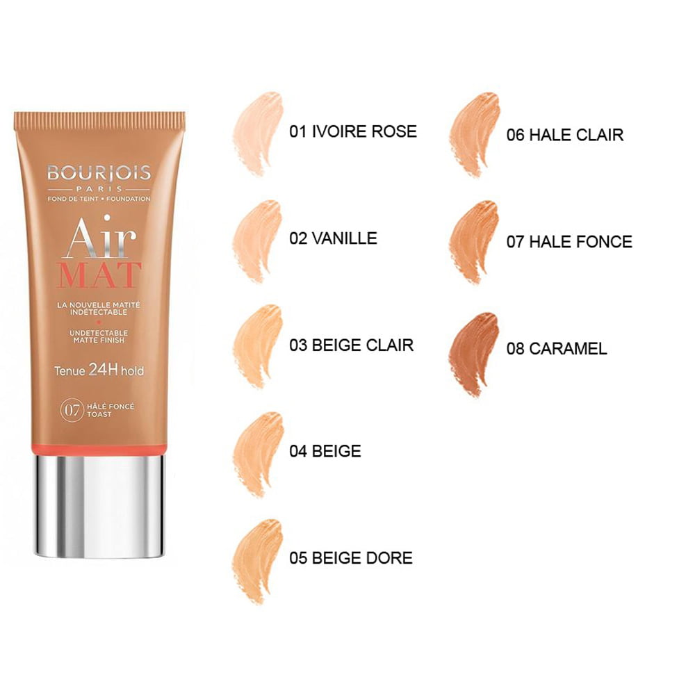 کرم پودر ایرمت بورژ‌وا AirMat 02 از نوع مایع و با ماندگاری 24 ساعته برای خانم‌هایی که فرصت تمدید آرایش را نخواهند داشت گزینه مناسبی خواهد بود. کرم پودر ایر مات هماهنگ با رنگ پوست شما خواهد بود و از آن به‌عنوان یک زیرساز می‌توانید استفاده کنید.این کرم‌پودر با دارا بودن SPFP10 ضمن محافظت از پوست شما در مقابل اشعه‌ی مضر نور خورشید از ماندگاری بالایی برخوردار بوده که تا 24 ساعت اثر آن روی پوست شما خواهد ماند.
