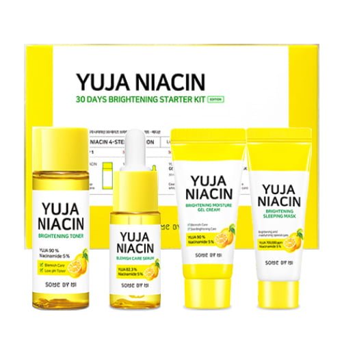 کیت روشن کننده 30 روزه یوجا نیاسین سام بای می Some By Mi شامل 30 میلی لیتر تونر + 10 میلی لیتر سرم + 30 میلی لیتر کرم ژل + 20 گرم ماسک شب میباشد که همگی حاوی عصاره یوجا، گلوتاتیون و آربوتین برای ایجاد پوستی روشن و ضد چروک هستند. یوجا نوعی مرکبات است که غنی از ویتامین C میباشد و در روشن کردن پوست بسیار مؤثر است ( از 600 کیلوگرم یوجا تازه، 1 لیتر روغن یوجا بدست میآید). این کیت
